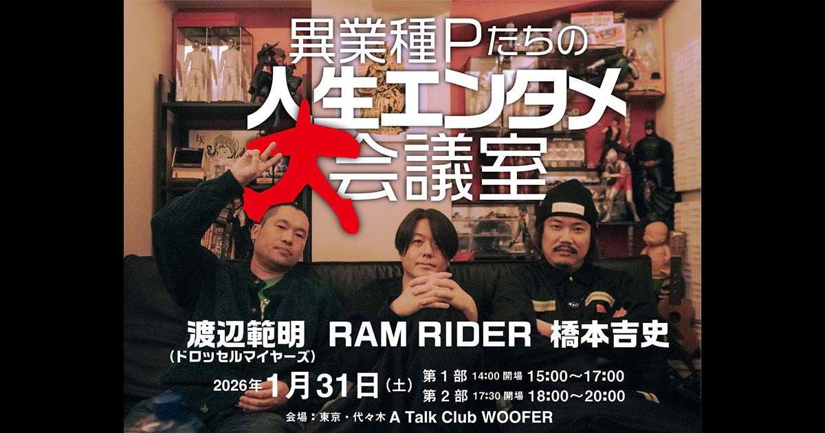 ラジオ、音楽、ゲーム……異なる専門分野をもつ40代プロデューサー3人の雑談ポッドキャスト『異業種P』初のリアルイベント開催! 2026年1月31日(土) 第1部:14:00開場/15:00開演/終演17:00 第2部:17:30開場/18:00開演/終演20:00 出演:橋本吉史、RAM RIDER、渡辺範明(ドロッセルマイヤーズ)